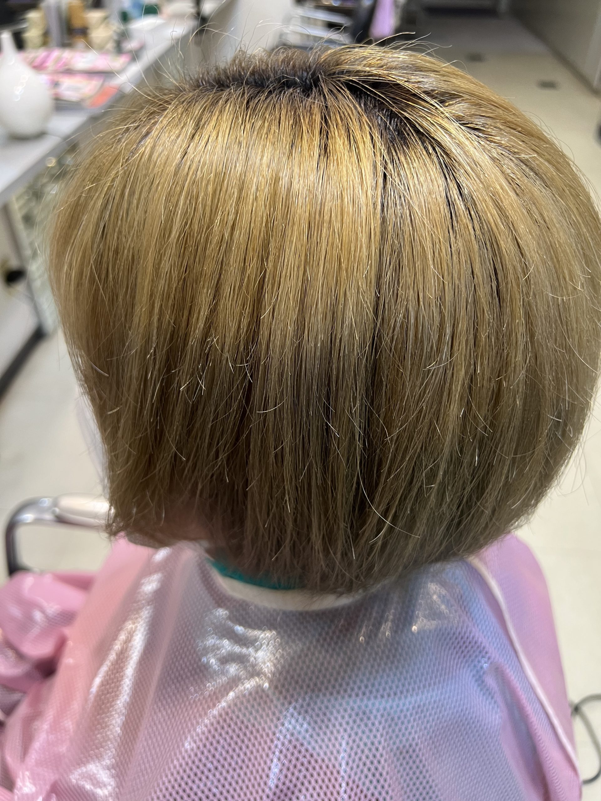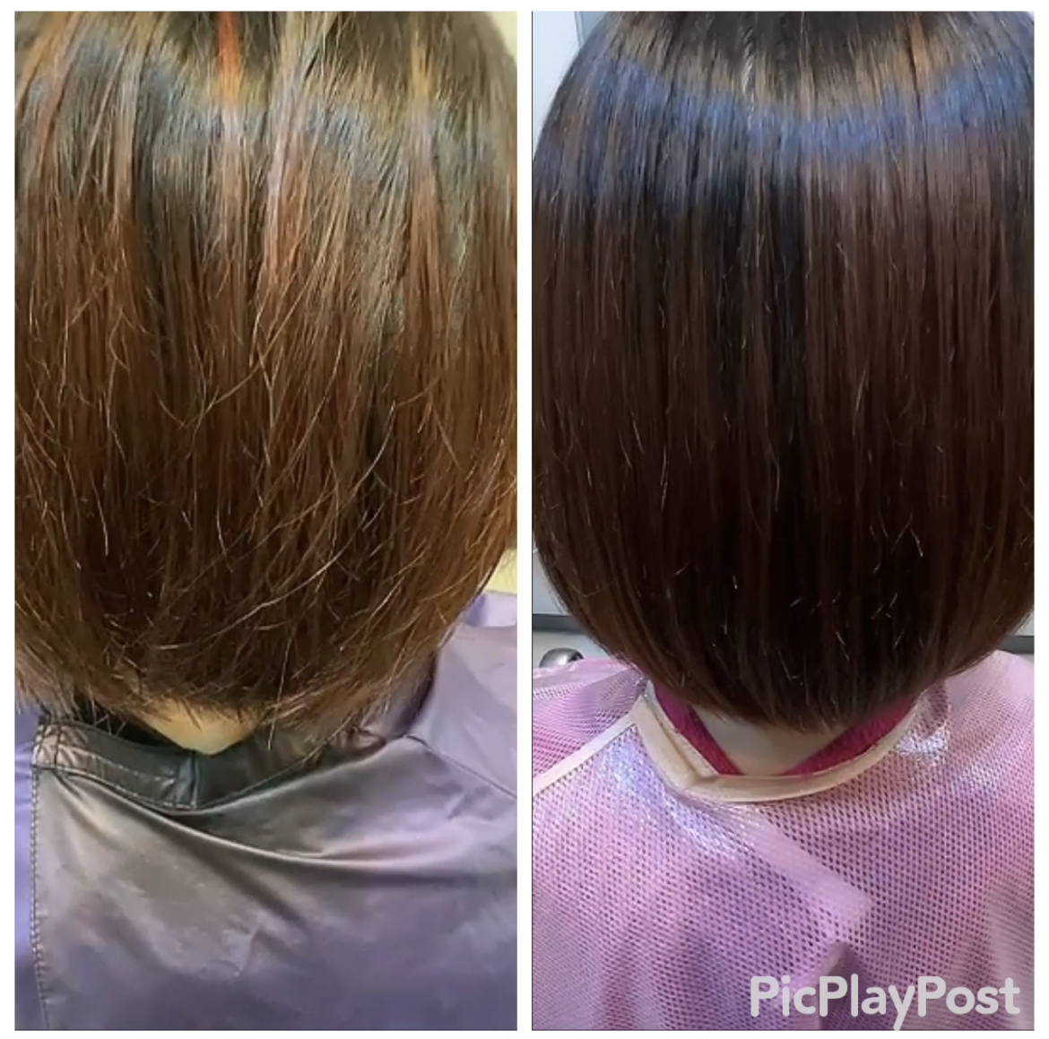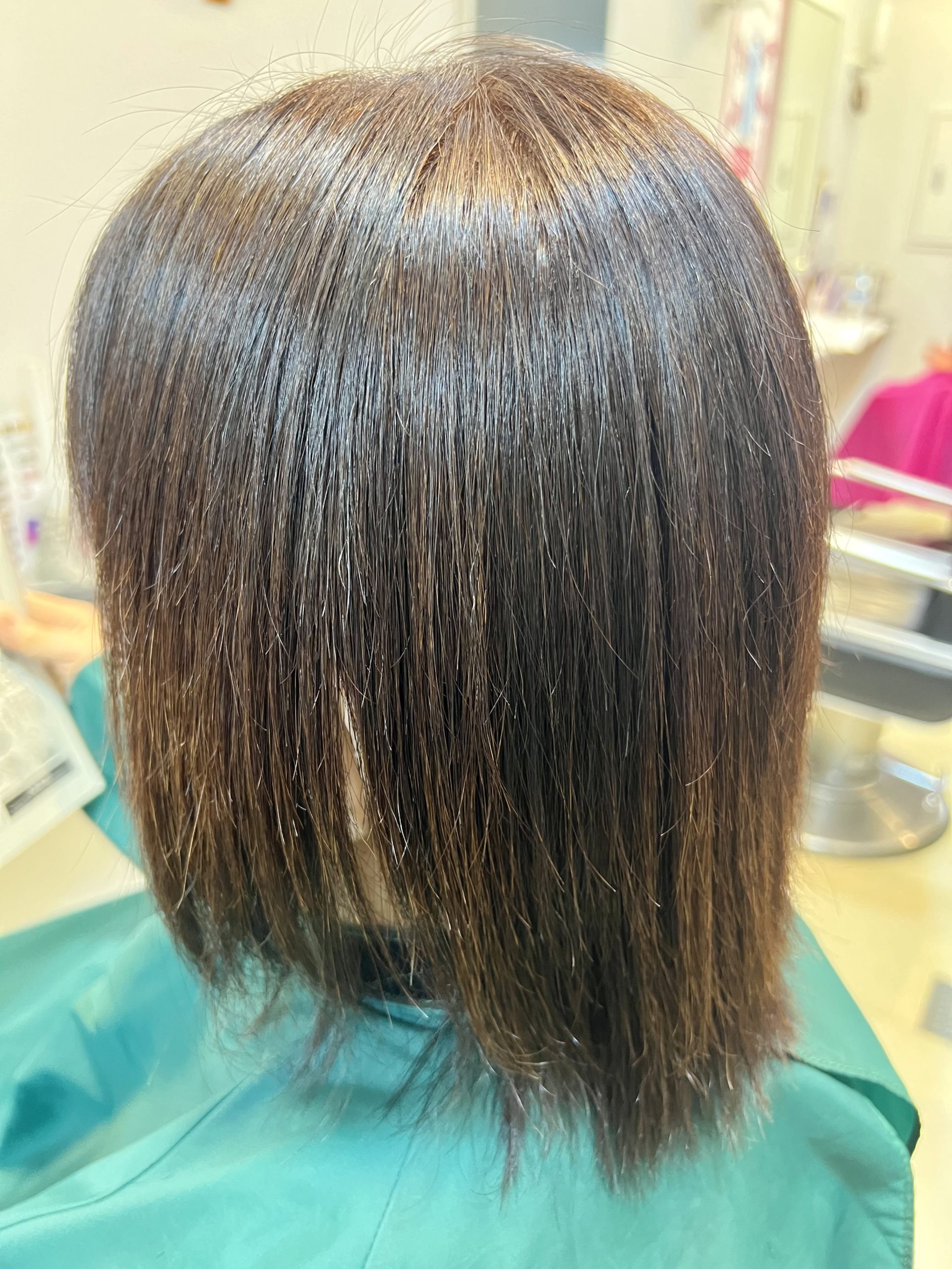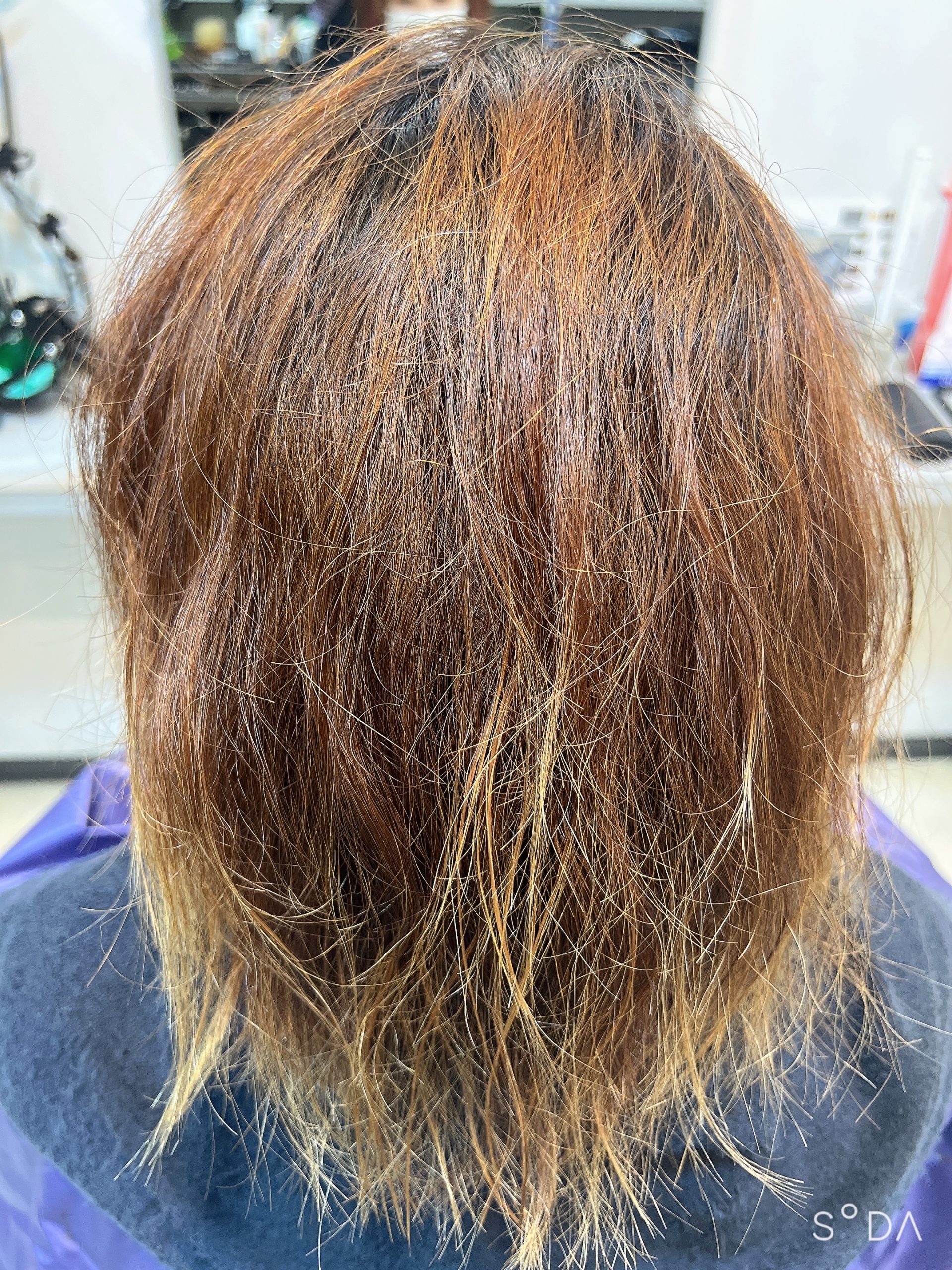 黒髪、カラー毛、ブリーチ毛の3種類の髪が混在する状態で縮毛矯正しました。 DATA年代:20代髪の太さ:太め癖の強さ:3矯正履歴:2年前カラー:4か月前カット状態:鋤き多い、耳後ろはツーブロックカット 写真がありませんが両サイドは複数回ブリーチされてイヤリングカラーが入ってます。毎日セルフアイロンで毛先ダメージもかなり蓄積されており、本来ブリーチしていない部分まで自然脱色が進んでブリーチしたかのようになっております。根元の黒髪をリタッチしてから矯正できると綺麗に伸ばしやすいのですがアレルギーを発症して現在染めは出来ないとのことでしたのでリタッチカラーで下地を整える事は出来ず薬剤を塗り分けて矯正しました。 カット無しなので毛先の荒れたブリーチ部分はそのままですがブローもアイロンもしておりません。 縮毛矯正を考えてみえる方はコチラよりご予約下さい。